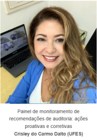 Representando a UFES, participaram todos os servidores da Audin, com destaque para a Chefe da Auditoria Crisley Dalto e do Auditor Bruno Picon, que também atuaram como palestrantes durante o evento, compartilhando experiências e boas práticas da Auditoria Interna da Ufes apresentando o painel "Monitoramento de Recomendações de Auditoria: Ações Proativas e Corretivas" destacando a importância do uso do BI na atividade de auditoria.